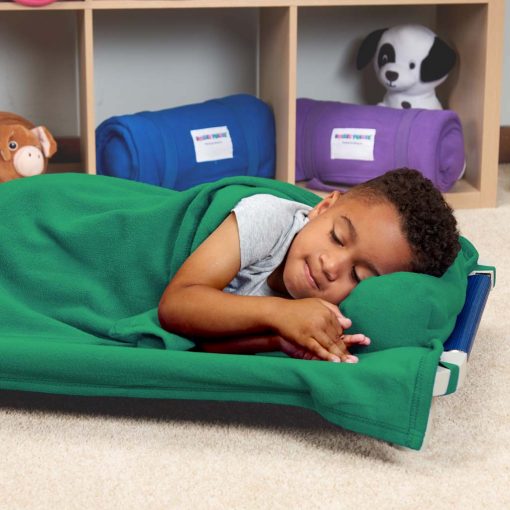 This patented All-in-One blanket/cot sheet/pillow rolls up small enough to easily fit in a backpack or school cubby, and attaches to standard-sized mats and cots.