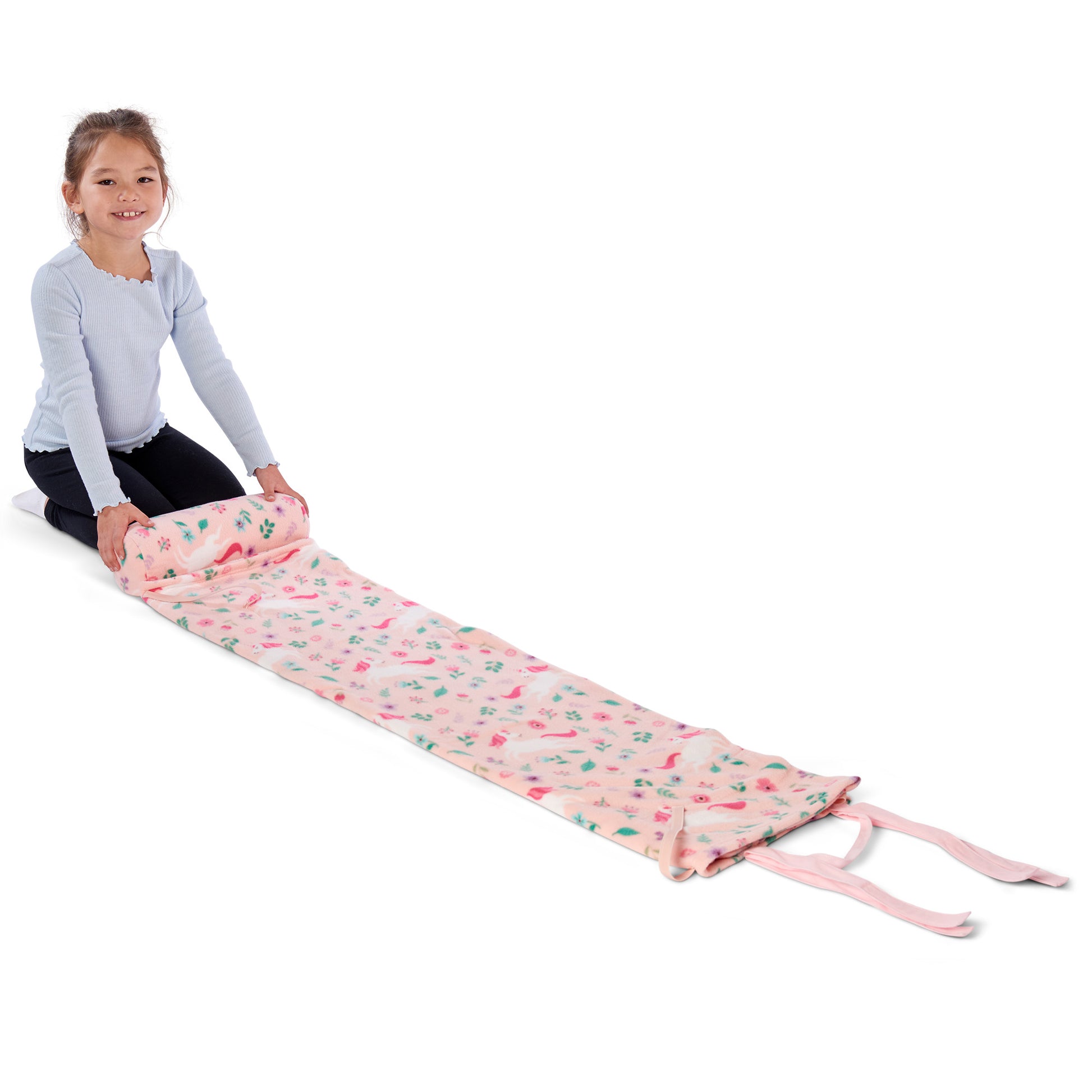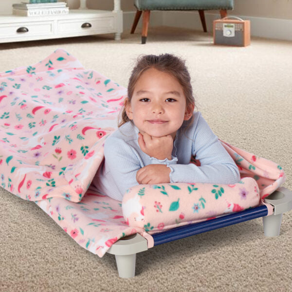 Step into a dreamy world with the “Unicorn Garden” Fleece Blanket Set, where unicorns and garden blooms create a magical scene on a soft pink background. This enchanting blanket is perfect for little ones who love all things whimsical, combining comfort with an imaginative design filled with flowers, leaves, and gentle unicorns. Super soft and ultra-cuddly, this fleece blanket comes with an attached pillow for extra coziness during naps and quiet time. Elastic straps on the back make it simple to secure to a cot or mat, keeping it in place through every twist and turn. Ideal for both home and daycare, it's designed to provide warmth and a touch of magic wherever it’s needed. Wrapped in softness and charm, this “Unicorn Garden” set is sure to delight, making naps a little sweeter and rest time a cozy escape into a fairytale world. Perfect for unicorn fans, it's a beautiful way to bring a bit of wonder to every day